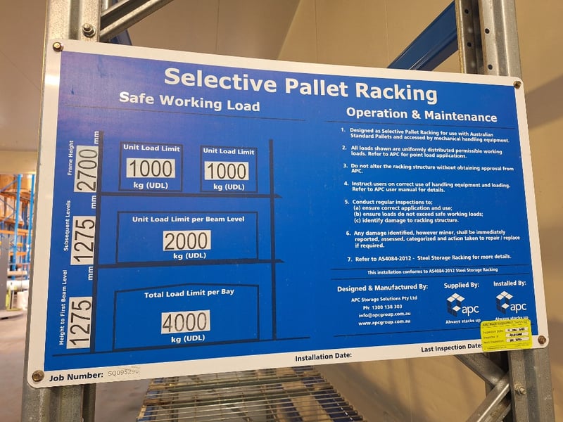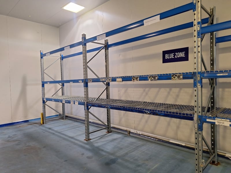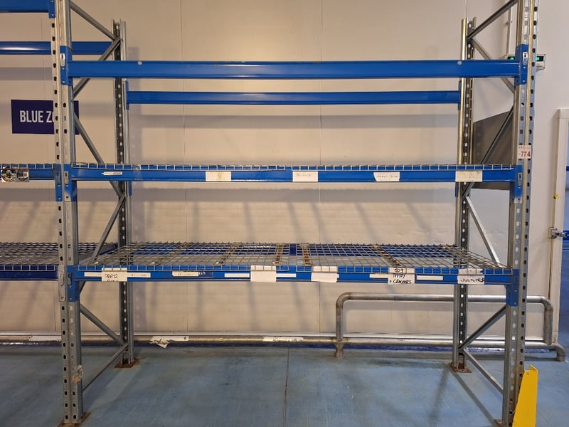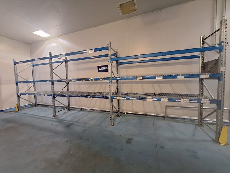 Storage Racking Dimensions Approx H:2700mm W:8000mm D:84mmNOTE: BOLTED TO FLOOR INSPECTIONS HIGHLY RECOMMENDED, BUYER TO PROVIDE OWN LABOUR AND TOOLS FOR SAFE REMOVAL OF ASSET