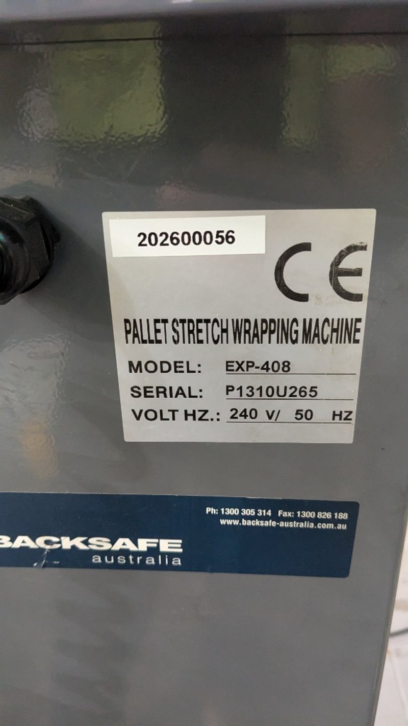 Pallet Stretch Wrapping Machine Brand/Supplier: Backsafe AustraliaModel: EXP-408Serial Number: P1310U265Power Requirements: 240 V, 50 HZDescription/Extras: Includes Wrap, 240v Power, E StopNOTE: INSPECTIONS HIGHLY RECOMMENDED, BUYER TO PROVIDE OWN LABOUR AND TOOLS FOR SAFE REMOVAL OF ASSET