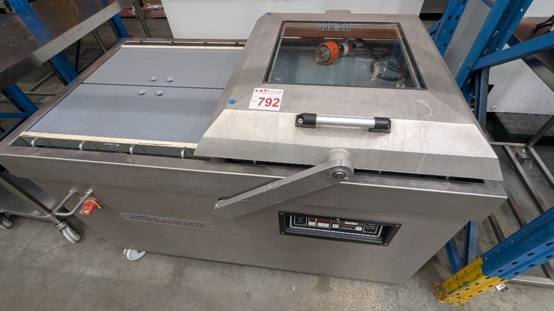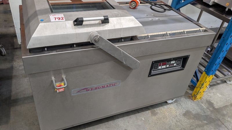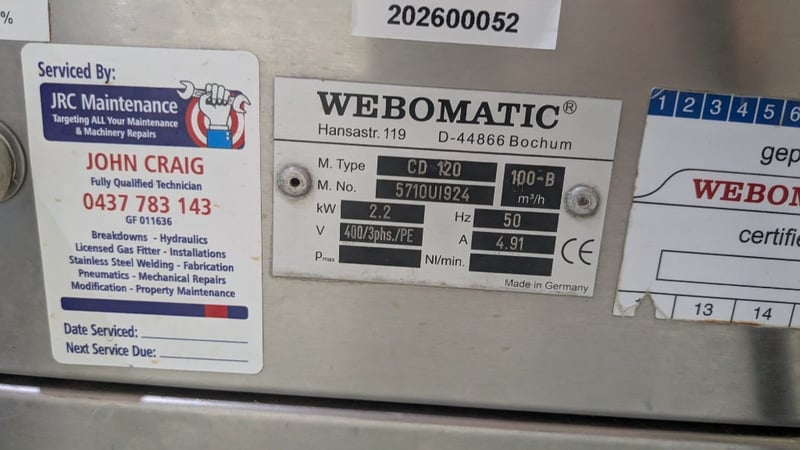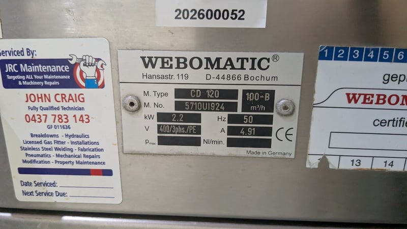 Webomatic industrial Vacuum Packing Machine Brand: Webomatic Model: CD 120 Machine Number: 571001924Power & Voltage: 2.2 kW, 400V (3-phase) Performance: 100 m3/h at 50 HzDescription/Extras: Stainless Steel Construction, Castors, Digital Display, Push Button Control Dimensions: 1450mm(W) x 780mm(D) x 900mm(H)