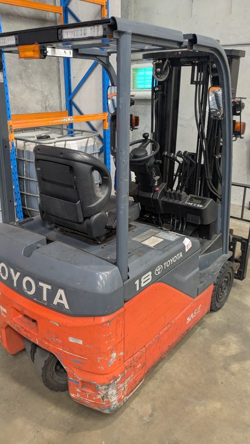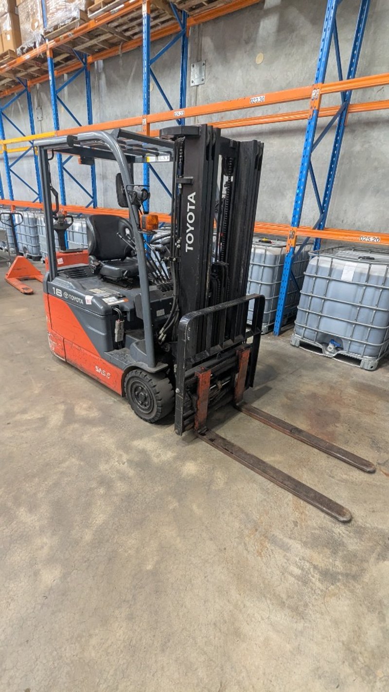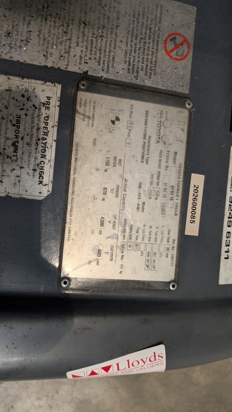 Toyota electric forklift truckModel: 8FBE18Chassis No: 8FBE18-53303Year of Manufacture: 2017Truck Weight (Without Battery): 2,510 kgMaximum Battery Weight: 915 kgMax Height: 4300mmHrs Indicated: Unsighted Description/Extras: 3 Stage mast, Automatic Adjustment Tines, FOPS, Solid Tires NOTE: INSPECTIONS HIGHLY RECOMMENDED, BUYER TO PROVIDE OWN LABOUR AND TOOLS FOR SAFE REMOVAL OF ASSET