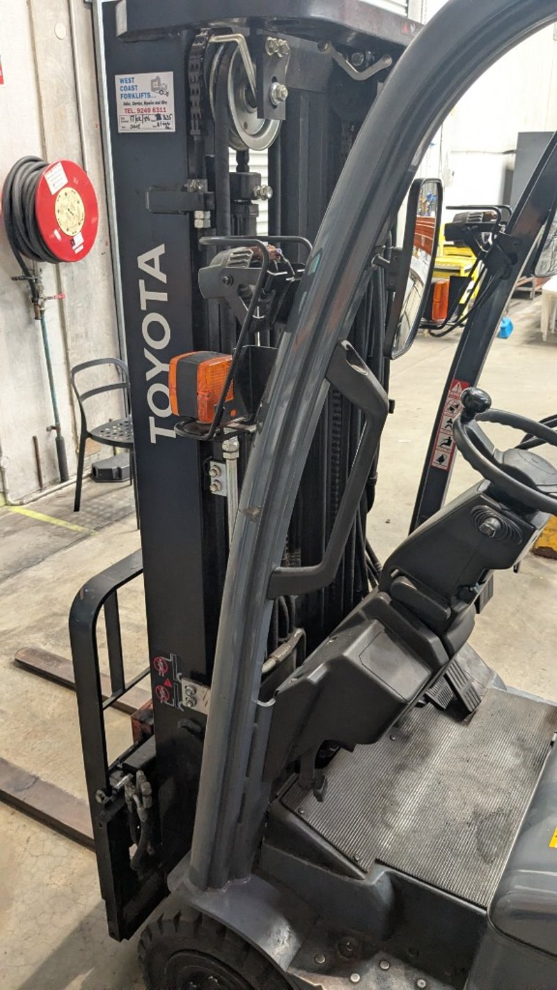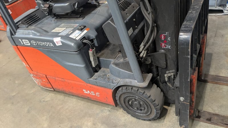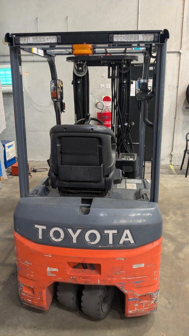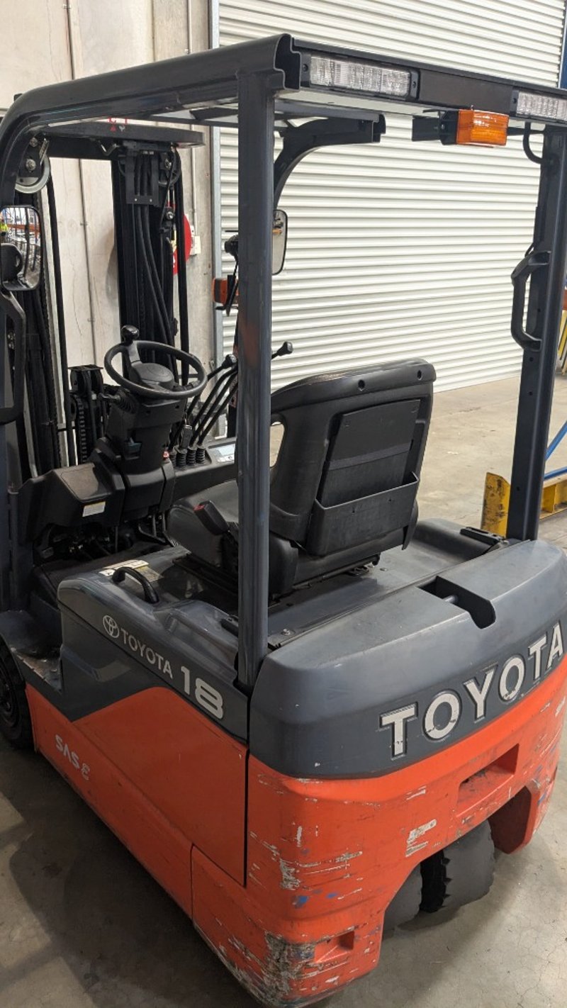 Toyota electric forklift truckModel: 8FBE18Chassis No: 8FBE18-53303Year of Manufacture: 2017Truck Weight (Without Battery): 2,510 kgMaximum Battery Weight: 915 kgMax Height: 4300mmHrs Indicated: Unsighted Description/Extras: 3 Stage mast, Automatic Adjustment Tines, FOPS, Solid Tires NOTE: INSPECTIONS HIGHLY RECOMMENDED, BUYER TO PROVIDE OWN LABOUR AND TOOLS FOR SAFE REMOVAL OF ASSET