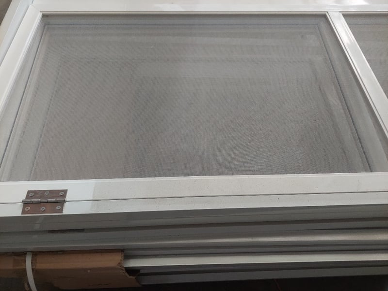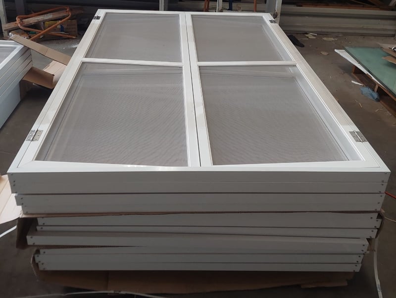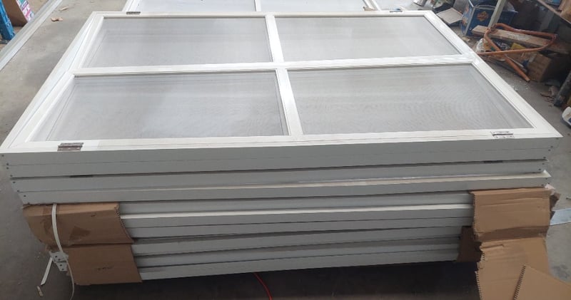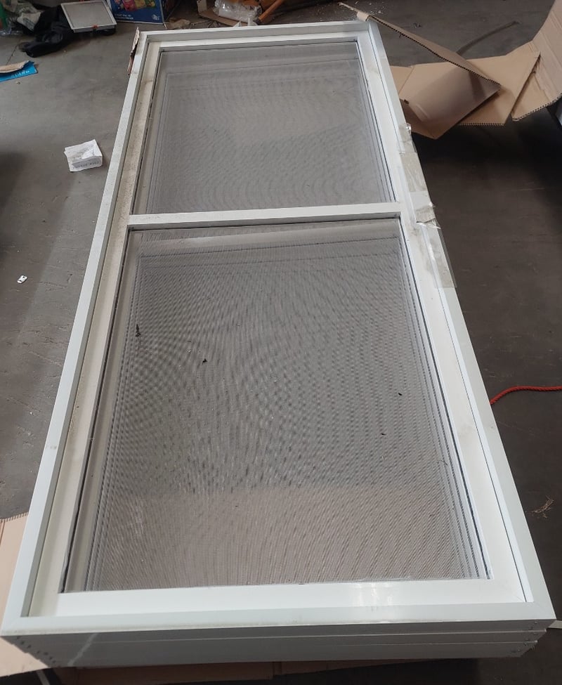 Assorted lot includes white-framed flyscreen windows and white aluminum sliding doors featuring a mesh screen.Dims for Windows: 200cm H, 81cm W, 5cm DDims for doors: 2000cm H, 140cm W, 5cm DQty per pallet.Sold as lot. Notes: signs of wear.