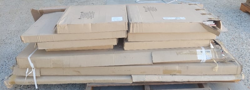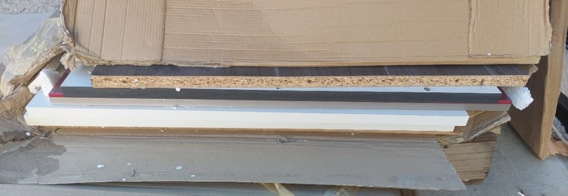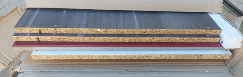 Assorted lot includes, Modularflat pack polyurethane kitchens,maroon and a aluminium sliding window black.