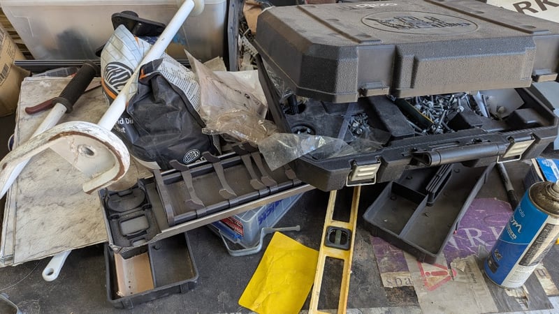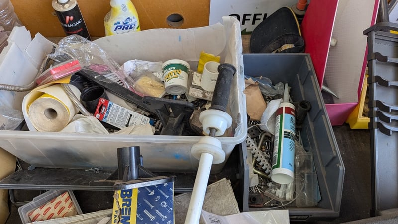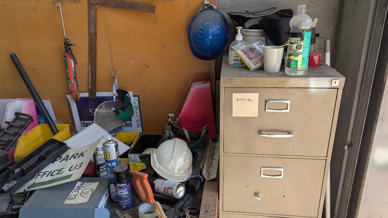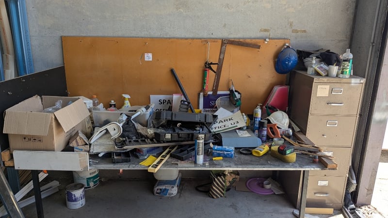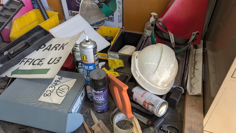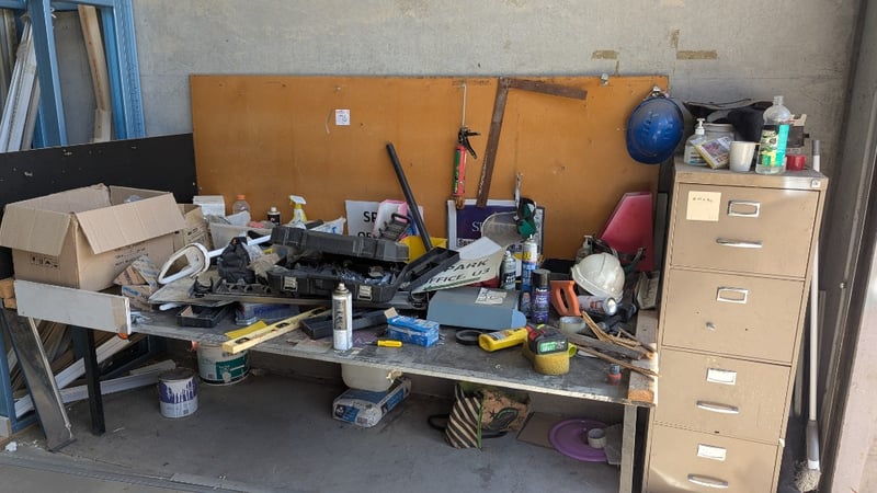 Work Bench with Contents, Including Adjustable Feet, Sctews, Safety Helmets, Face Guards, Filing Cabinet and More, Quantity Per Lot