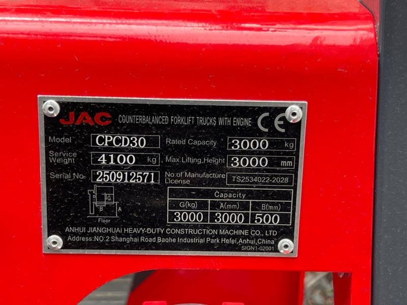 Unused Forklift JAC CPCD30 Year 2025 Container Mast Side Shift Solid Tyres Diesel Engine Max Lifting Height 3000mm Rated Capacity 3000kg Service Weight 4100Kg Fork Tynes 1620mm Work Lights Flashing Beacon Serial: 250912571 Location: Carole Park, QLD Contact: Gage on 0458 732 549 or alternatively [email protected] Collections: Strictly within 2 weeks of auction closing