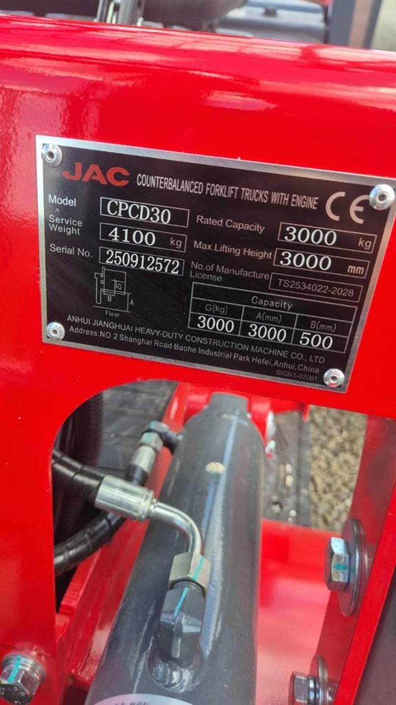 JAC Forklift CPCD30 Year 2025 Container Mast Side Shift Solid Tyres Diesel Engine Max Lifting Height 3000mm Rated Capacity 3000kg Service Weight 4100Kg Fork Tynes 1620mm Work Lights Flashing Beacon Serial: 250912572 Location: Dalby, QLD Contact: Gage on 0458 732 549 or alternatively [email protected] Collections: Strictly within 2 weeks of auction closing