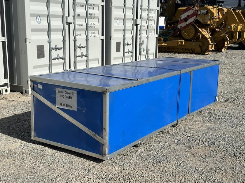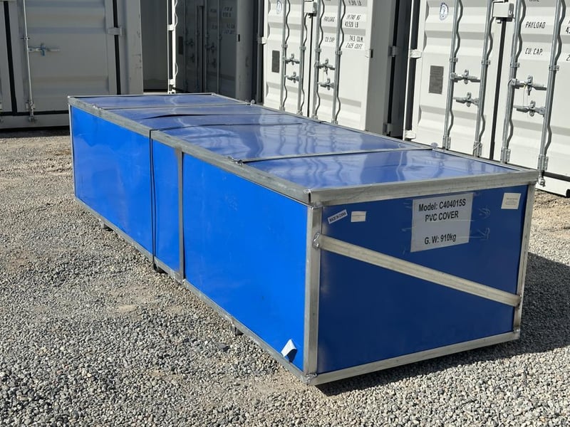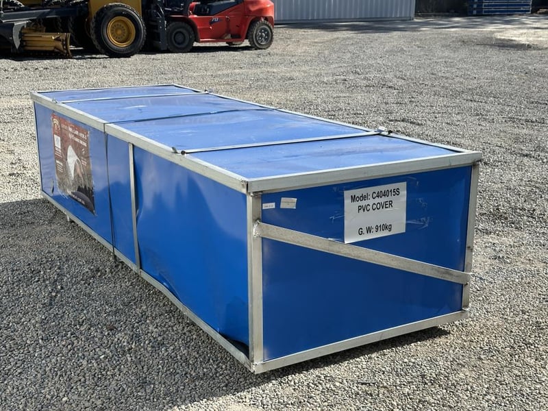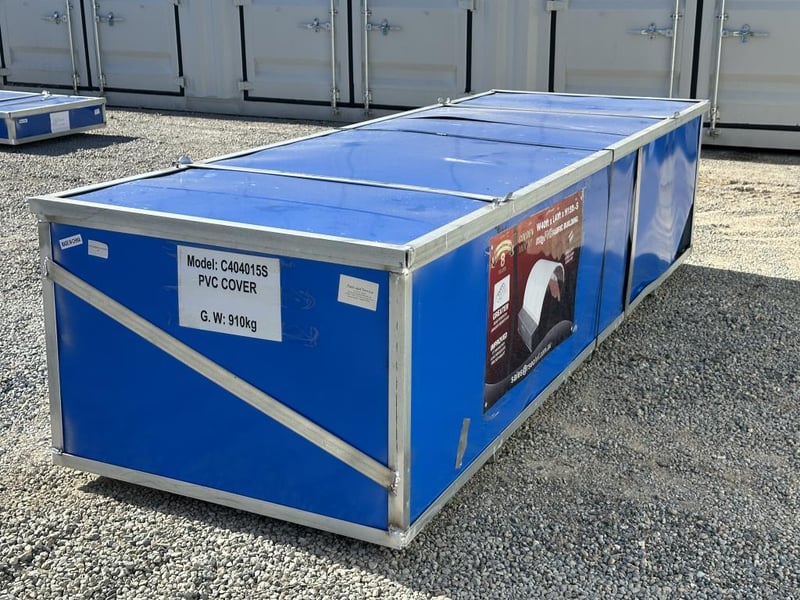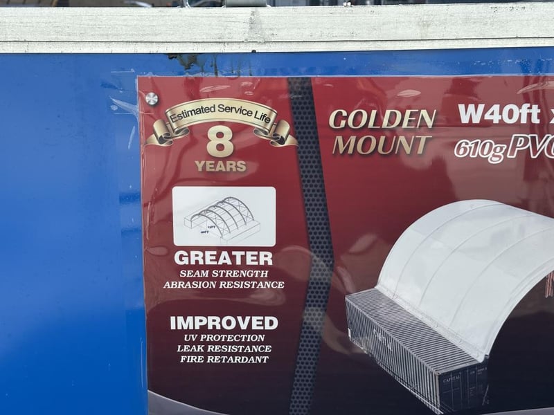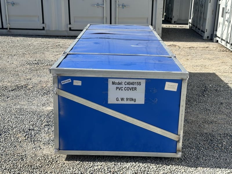 Heavy-duty white PVC tarpaulin that is water-resistant, fire-retardant, and UV-protected for long service life. The cover is secured to the base plates using ratchet-style straps.
