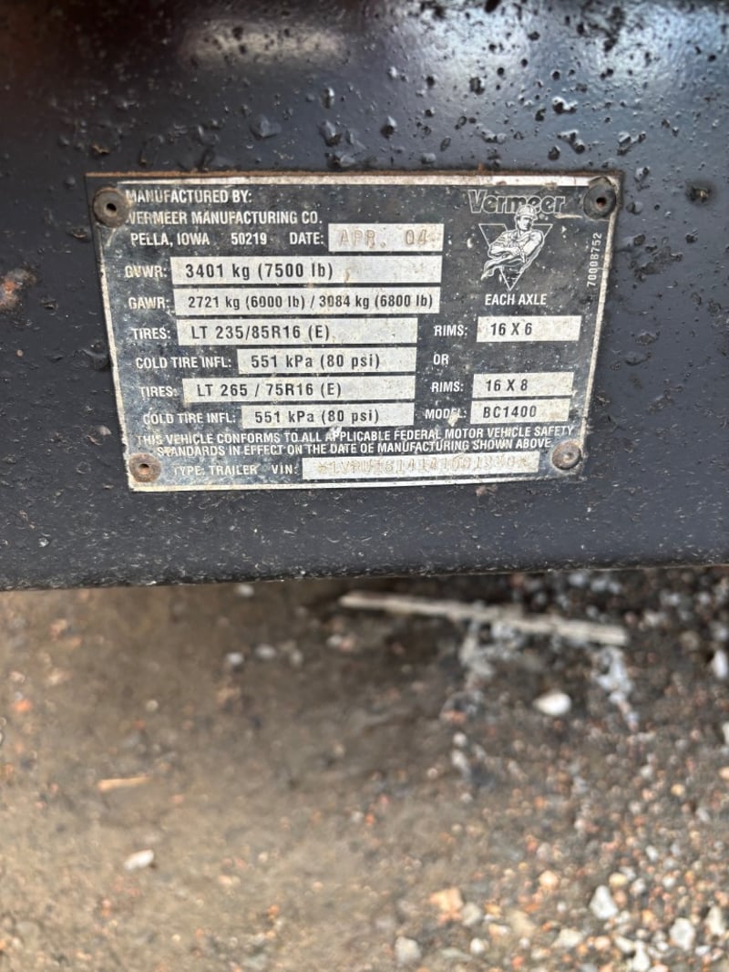 2004 Vermeer BC1400 Single Axle Wood Chipper trailer towable Year: 2004 Make: Vermeer Model: BC1400 Hours Indicating: 2,760 (When Photographed) VIN : 1VRU1614141001340 Has winch but no cable. Unknown working condition Inspection recommended. No rego or RWC Address: Onsite Cairns, QLD (Not Lloyds Branch)
