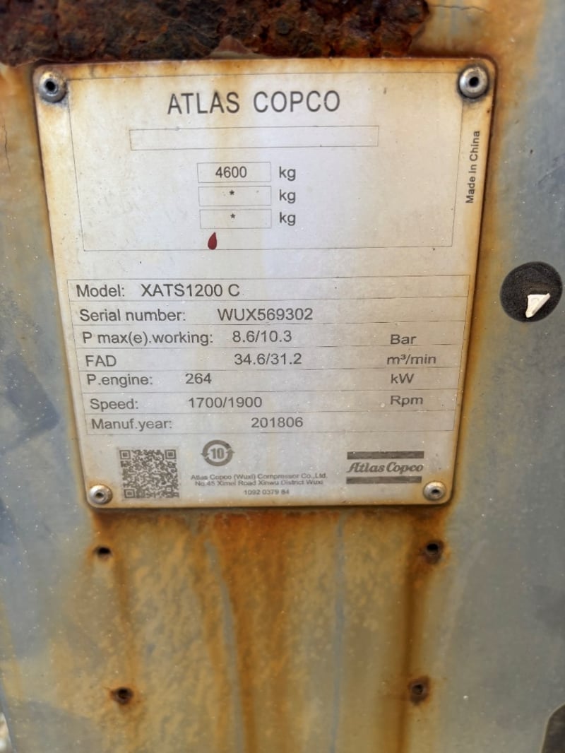 2018 Atlas Copco XATS1200 Portable Compressor Year: 2018 Make: Atlas Copco Model: XATS1200 Engine: Diesel Hours Indicating: 3,877 (When Photographed) Weight: approx 4.5T Serial No: WUX569302 1102 cfm @ 150 psi, cummins L x W x H - 4252 x 2100 x 2500 note - emergency stop error on control unit. Inspection recommended - No rego or RWC Address: Onsite Cairns, QLD (Not...