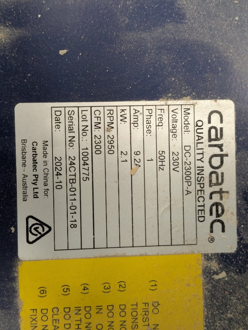 Carbatec Dust Collector Year: 2024 Make: Carbatec Model: DC-2300p-AS/N: 24CTB-011-01-18Voltage: 240vKW: 2.1Dimensions: L 550 x W 1650 x H 1500