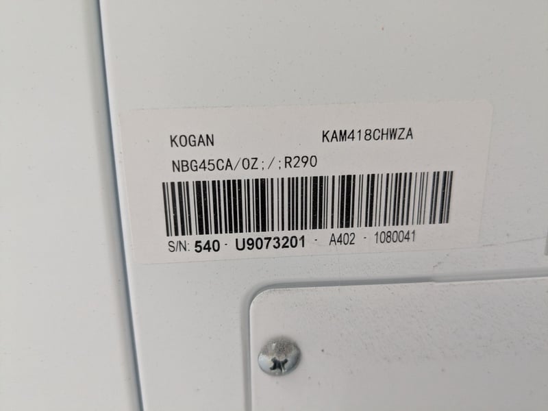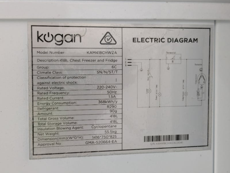 418L Chest freezer & fridge Make: Kogan Model: KAM418CHWZAGross Volume: 418LS/N: 540 U9073201