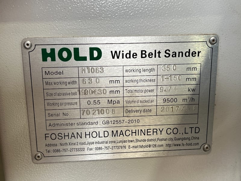 2017 HOLD M1063 Wide Belt SanderYear: 2017Make: HOLDModel: M1063Type: Wide Belt SanderSerial No: 7021008Made in: ChinaNotes: Integrated Conveyor Feed Table, Control Panel with Push Button Controls and Digital Display, SEW-Eurodrive Gear Motor and Drive Components.Location: Coomera QLD 4209