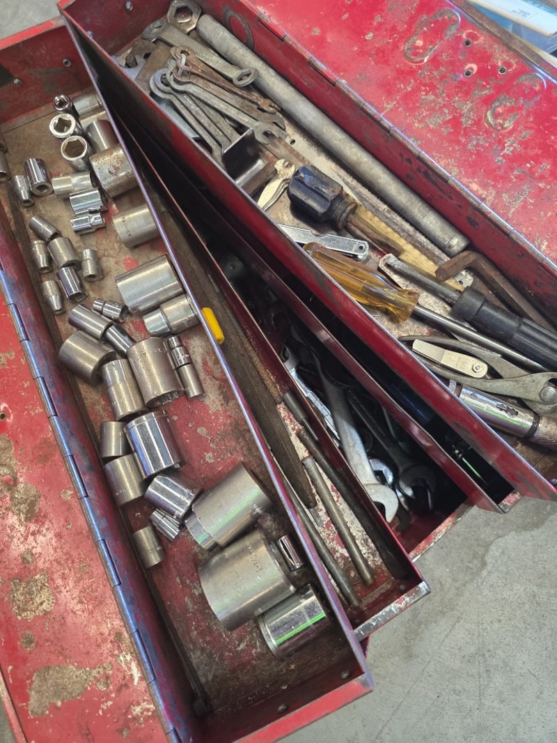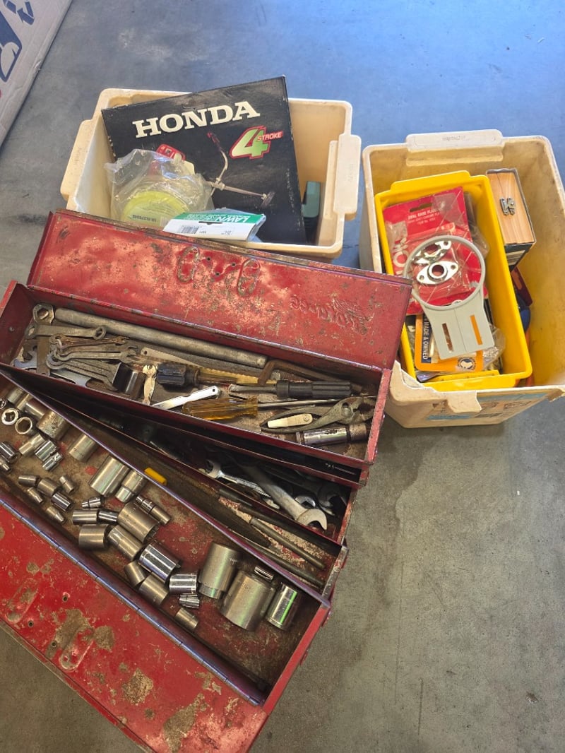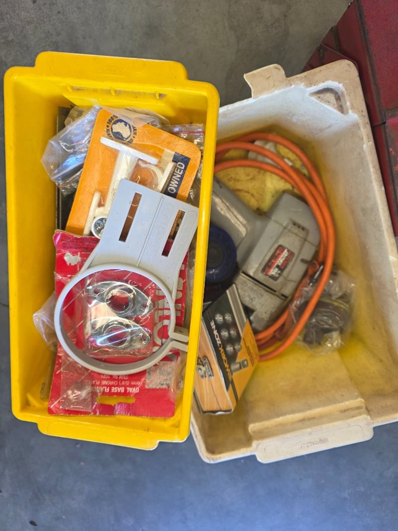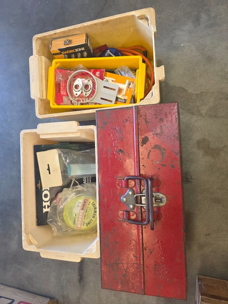 Toolbox and 3 plastic tubs containing various tools and hardware.
