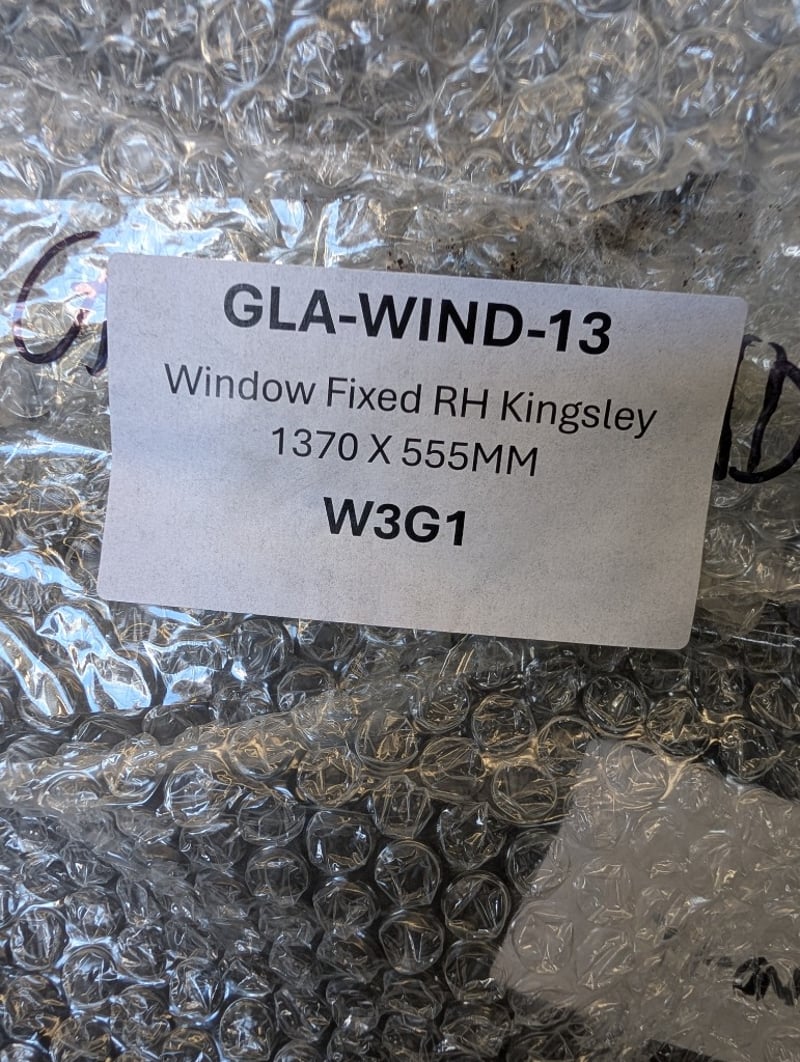 Window Fixed RH Kingsley model GLA-WIND-13 (W3G1). Suitable for caravan, motorhome, or RV applications. Black frame with clear glass panel Dimensions: 1370 x 555mm