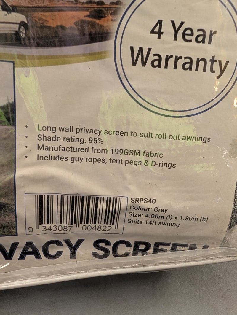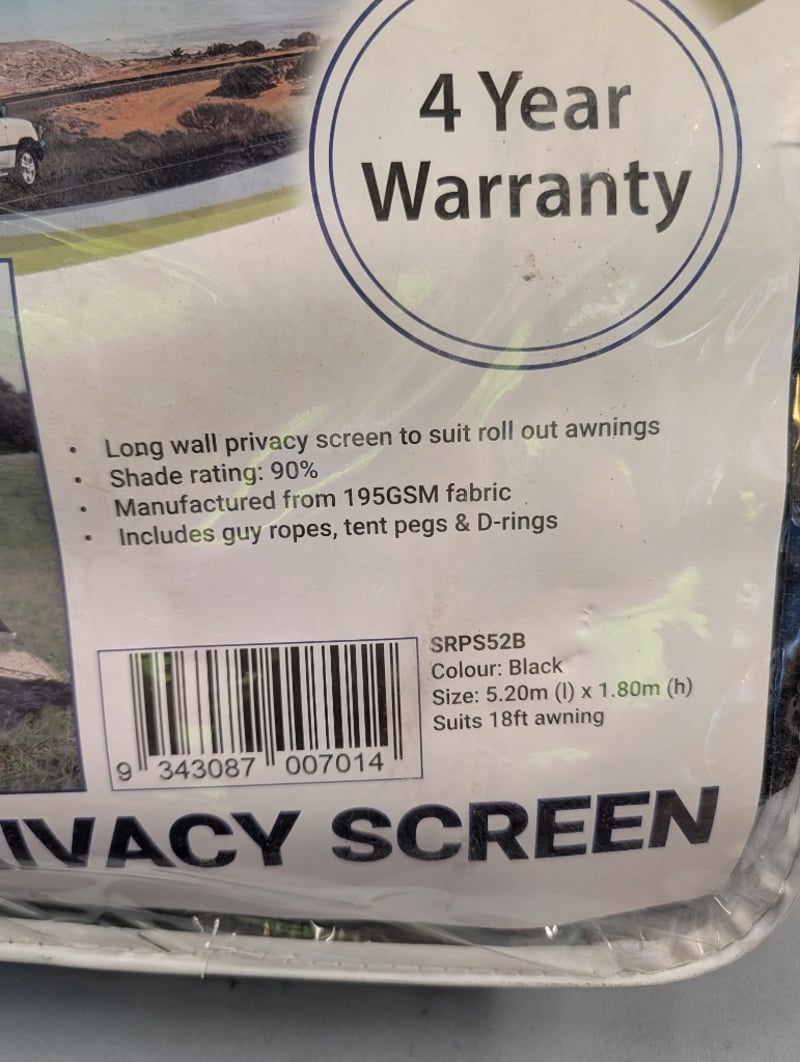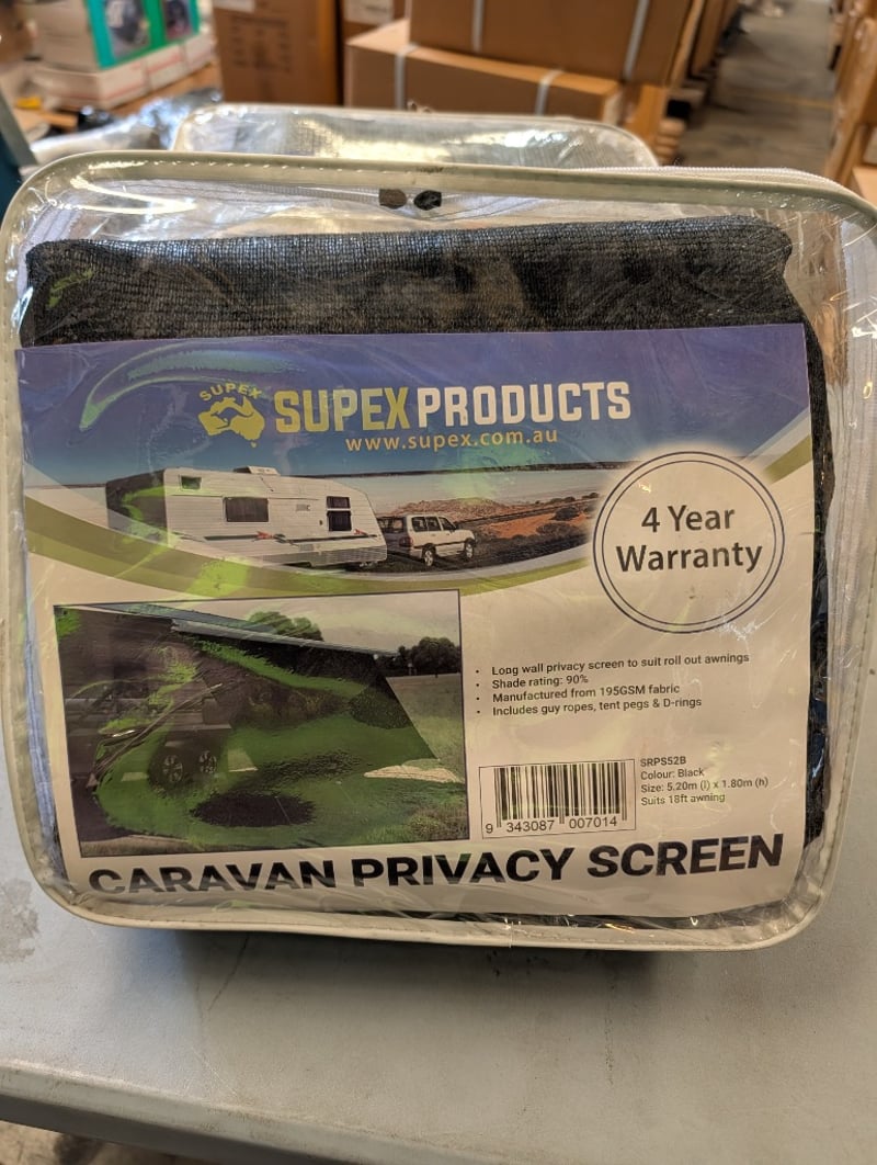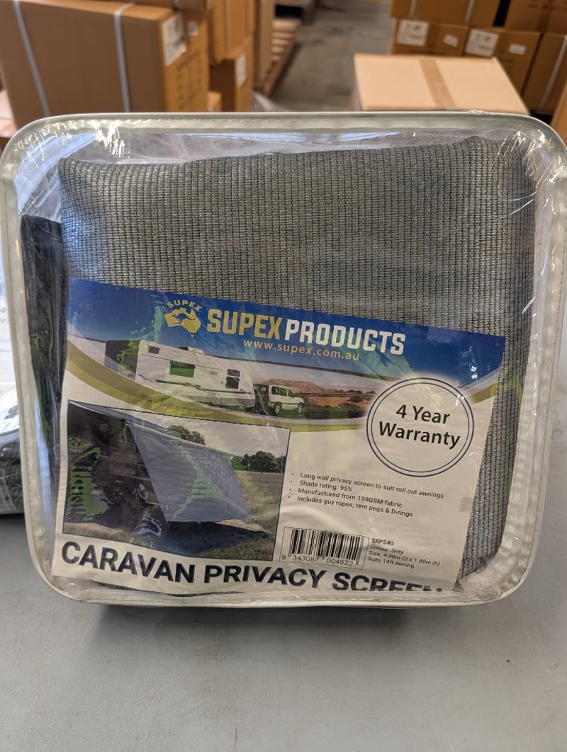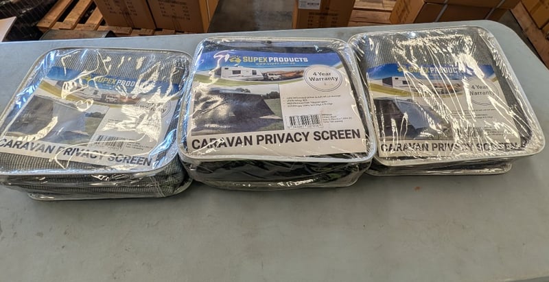 Lot of three Supex Products caravan privacy screens designed for roll-out awnings. Includes one black privacy screen (model SRPS52B, 5.20m length x 1.80m height, suits 18ft awning) with 90% shade rating, manufactured from 195GSM fabric. Two grey privacy screens (model SRPS40, 4.00m length x 1.80m height, suits 14ft awning) with 95% shade rating, manufactured from 199GSM fabric. All three screens feature long wall design, include guy ropes, tent pegs and D-rings for secure installation