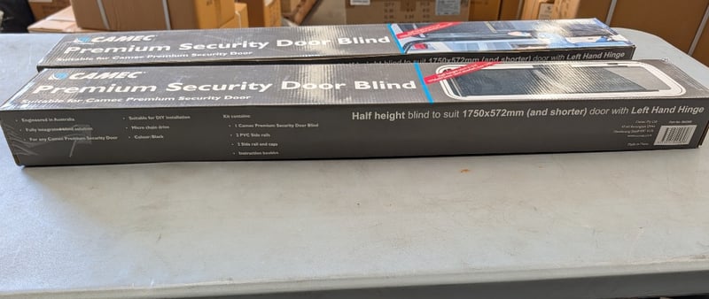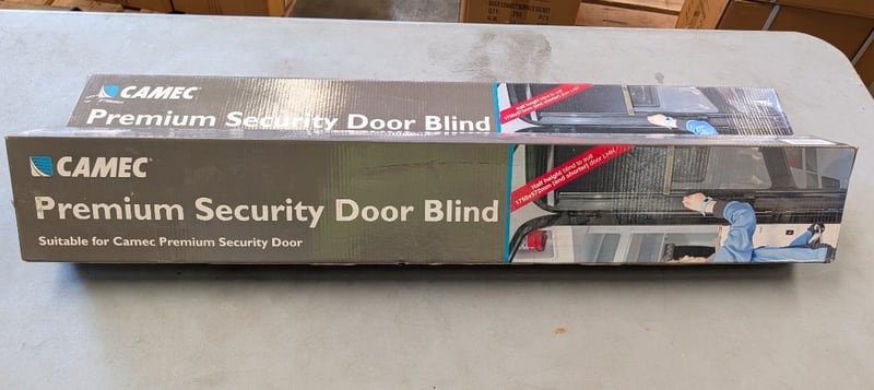 Camec Premium Security Door Blind designed for Camec Premium Security doors. Half-height blind suitable for doors with left-hand hinge, fitting 1750x572mm (and shorter) door apertures. Australian-made product. Includes blind, 1 PVC side rails, side rail end caps, and installation brackets. Suitable for DIY installation. Features colour-match design. Engineered in Australia with professional-grade construction.