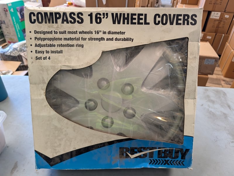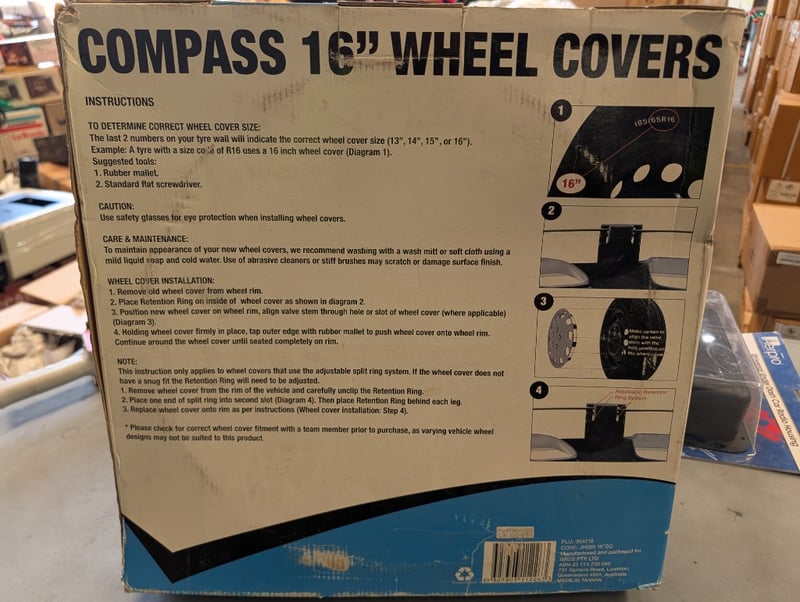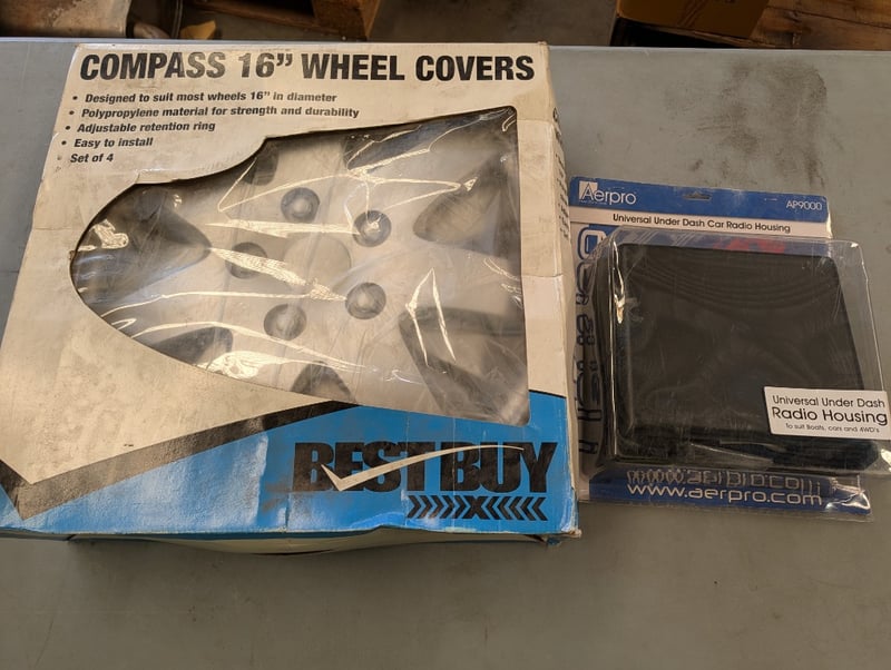 Lot comprising of Universal Under Dash Car Radio Housing and Compass 16" Wheel Covers
