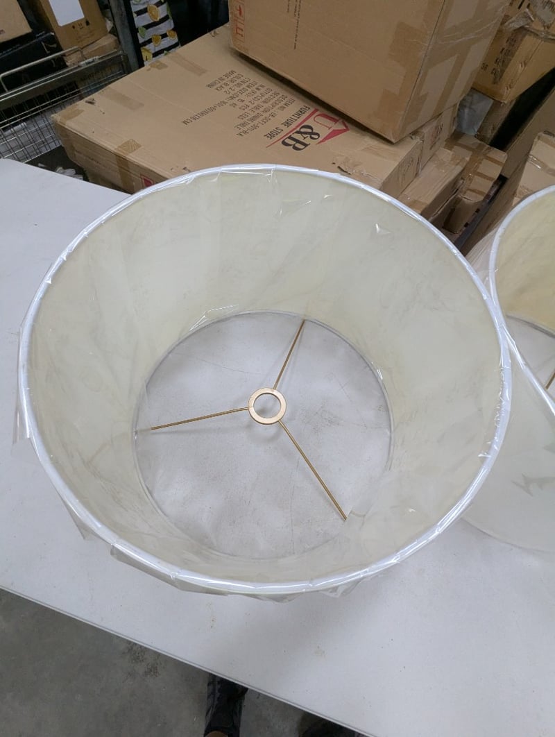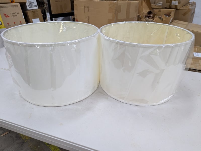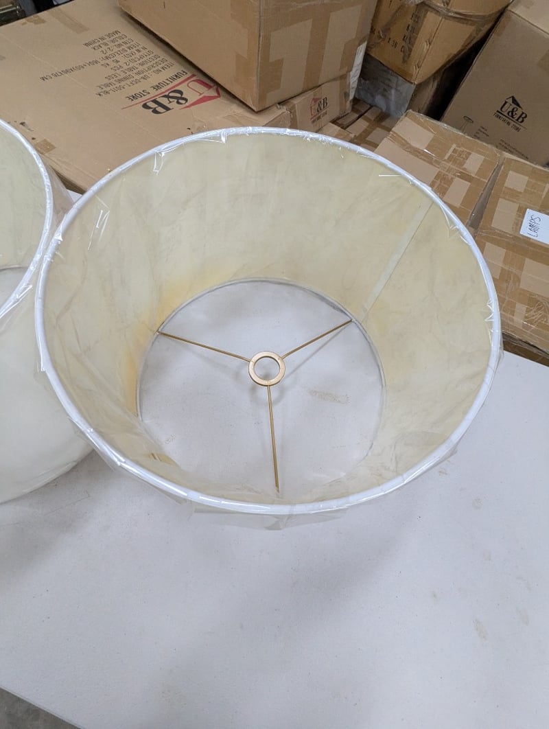 Lamp shades, white, tan metal frame, 2 per boxDimensions: H 31cm x W 44.5cm x D 44.5cmBID PER BOX