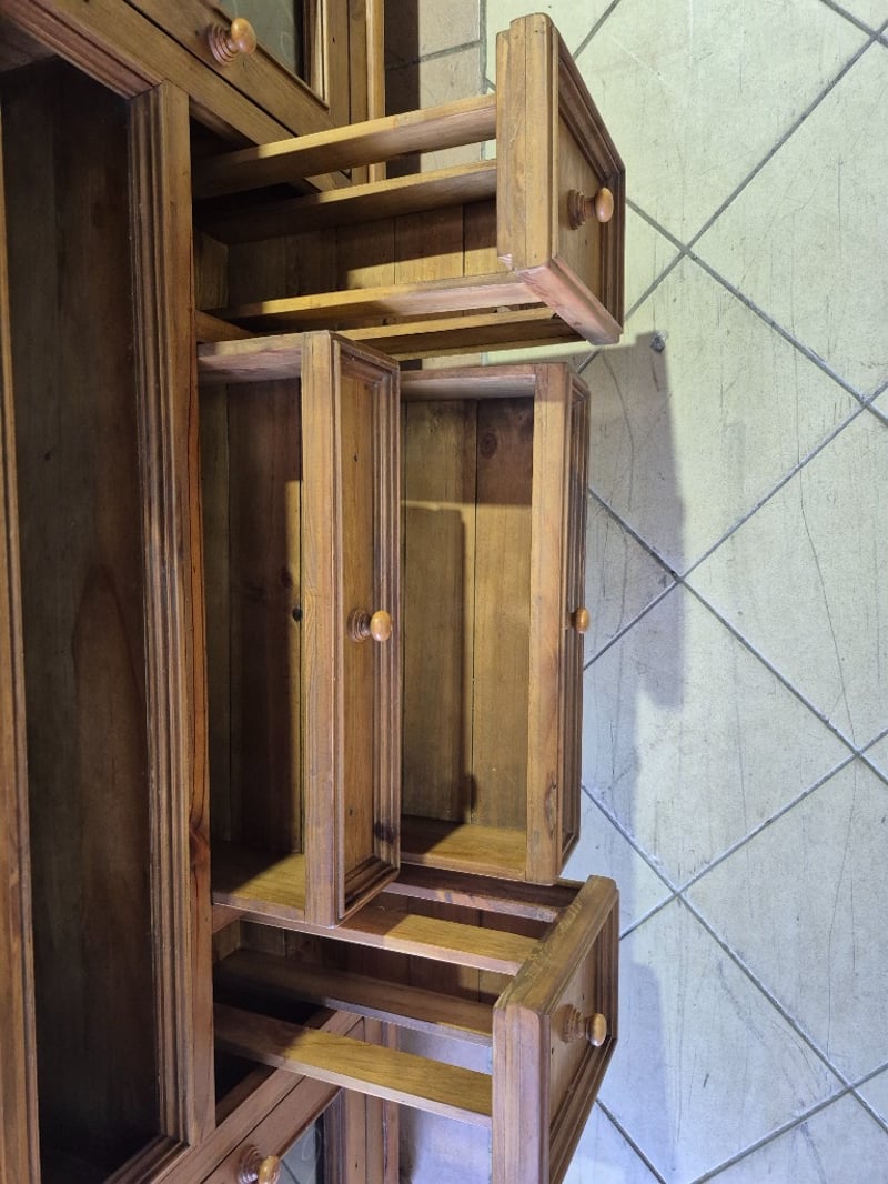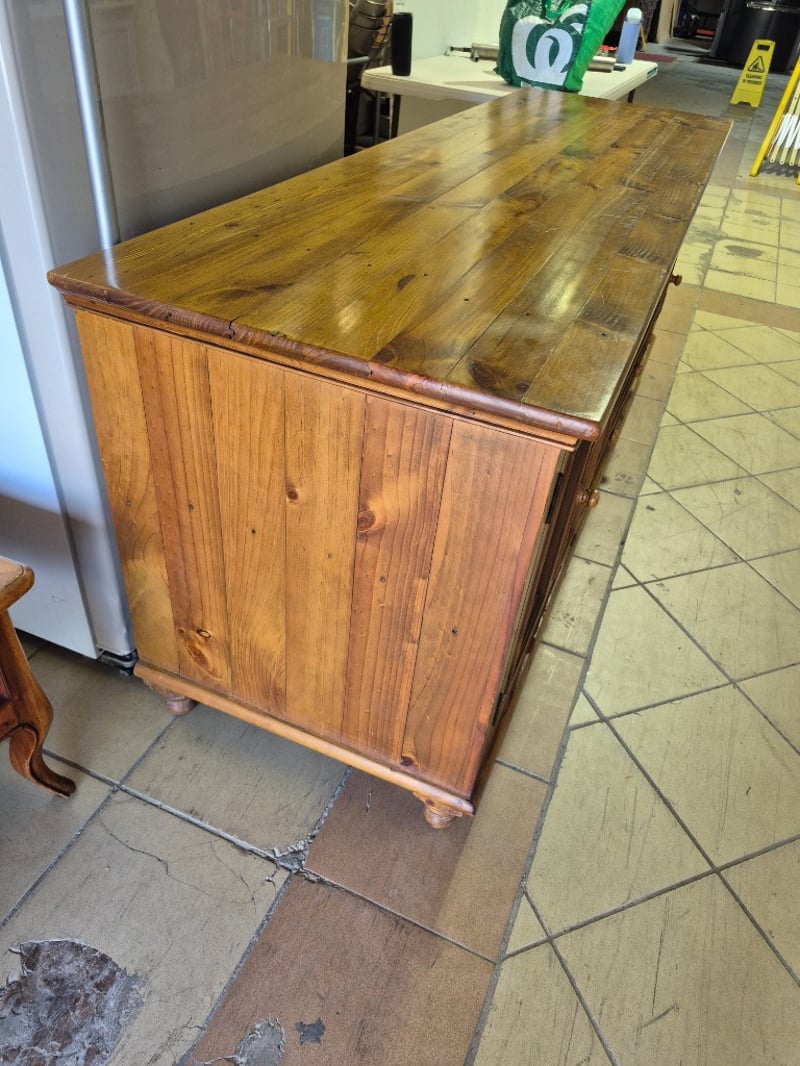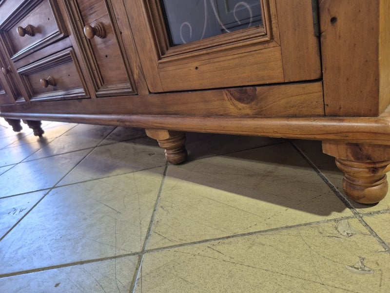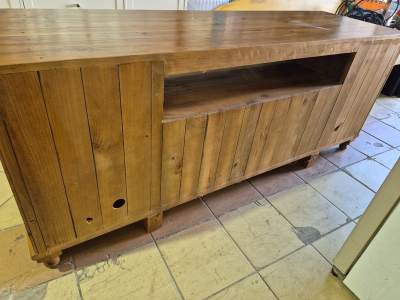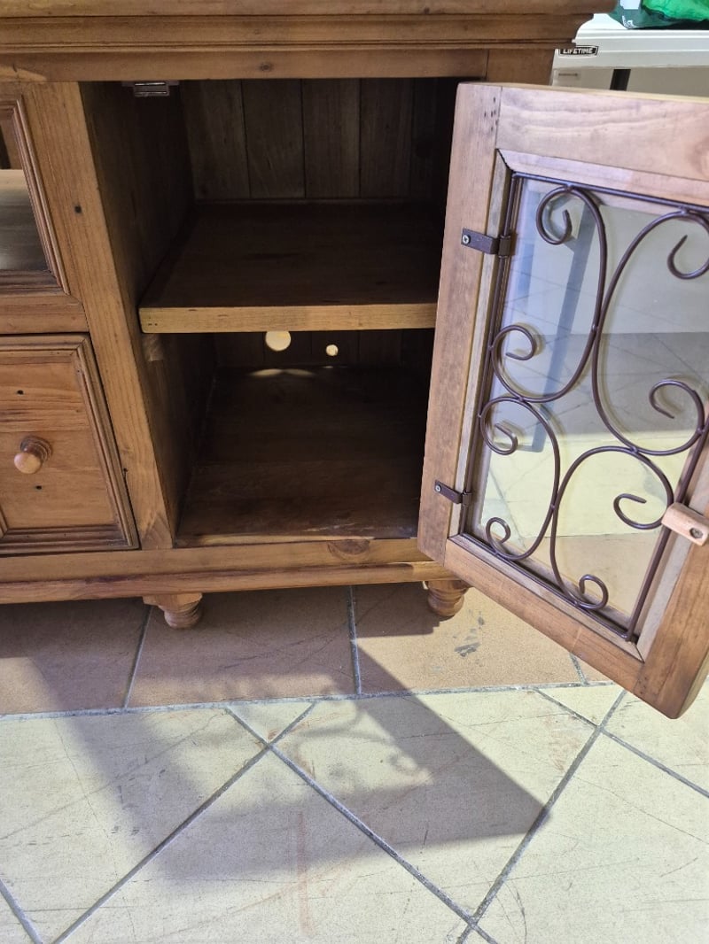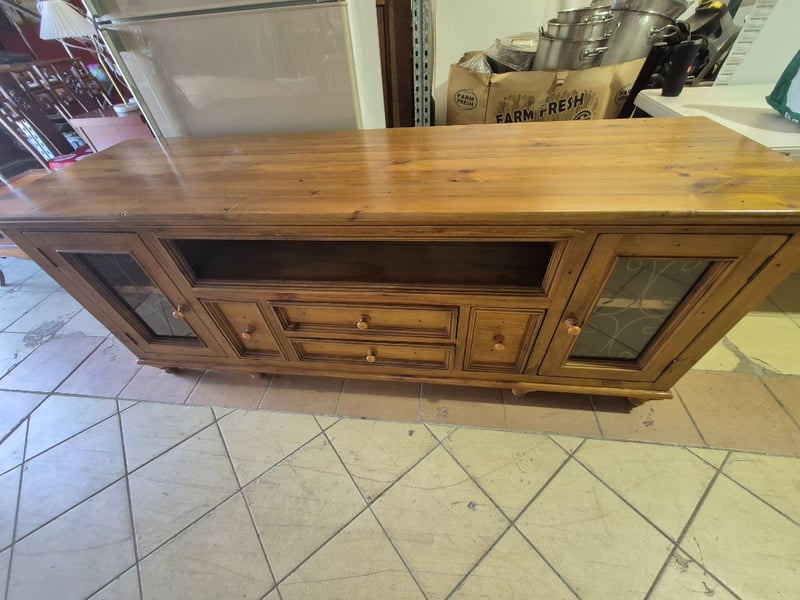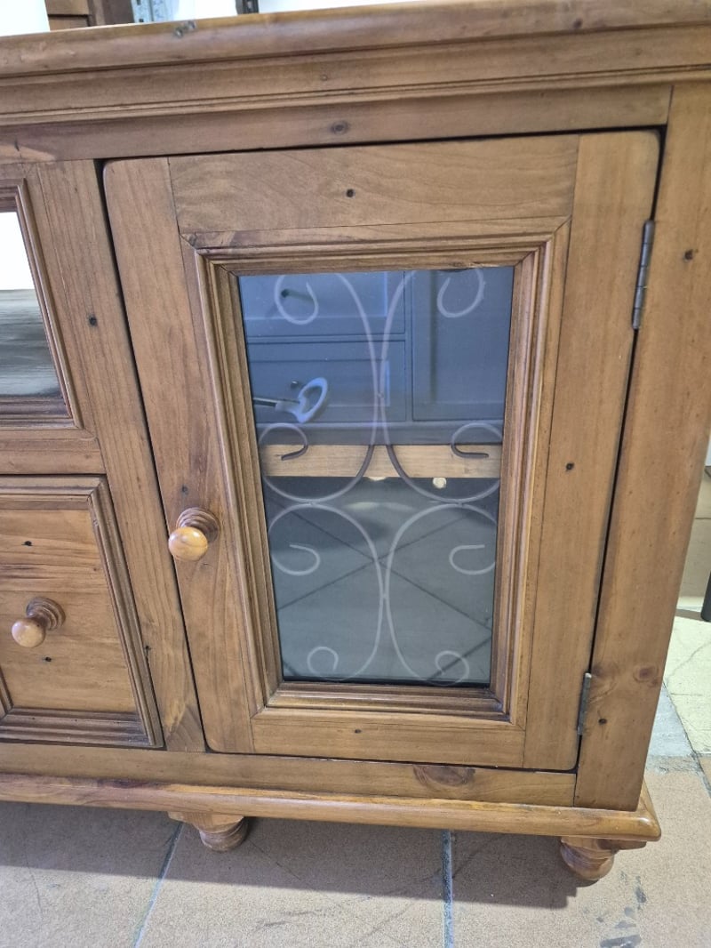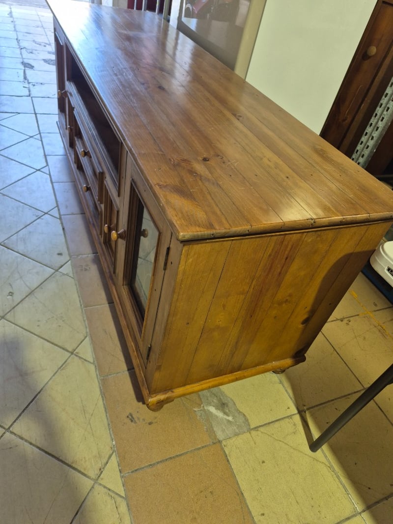 TV cabinet, timber, glass panel doors, round timber legsDimensions: H: 78cm W: 200cm D: 61cm