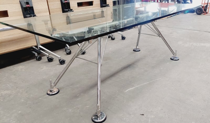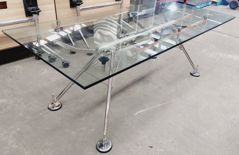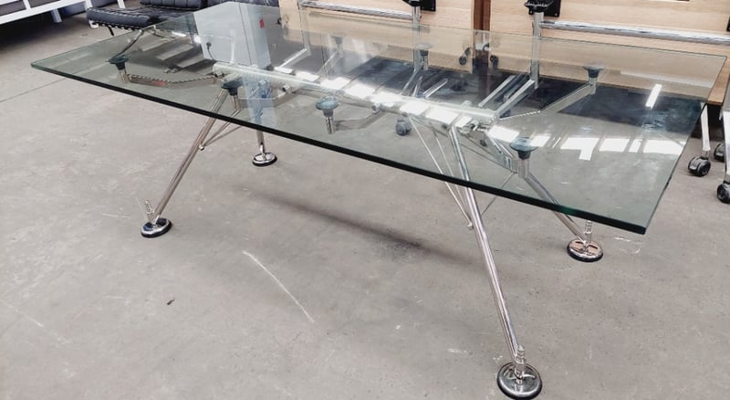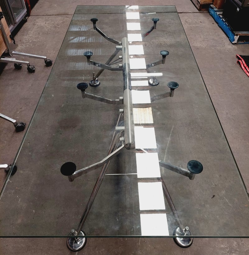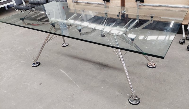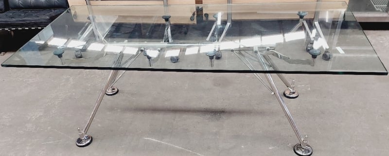 Glass top dinning table. Dimensions: 220cm L, 100cm W, 77cm H Note: signs of wear.