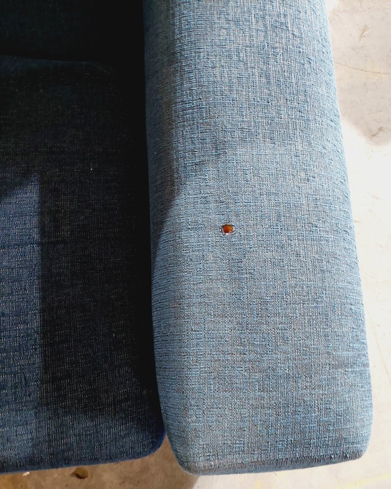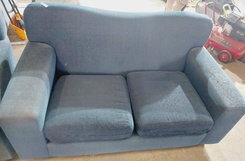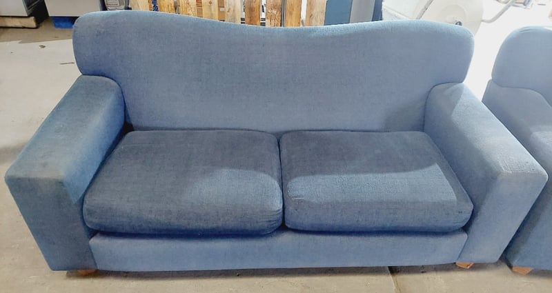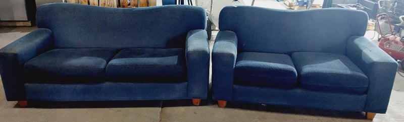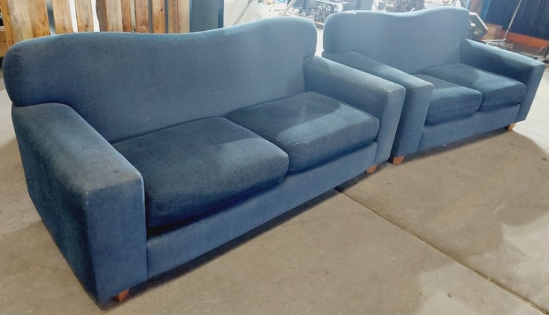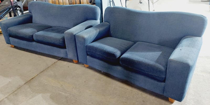 Blue fabric upholstered sofas. Sold as a lot. Note: signs of wear.