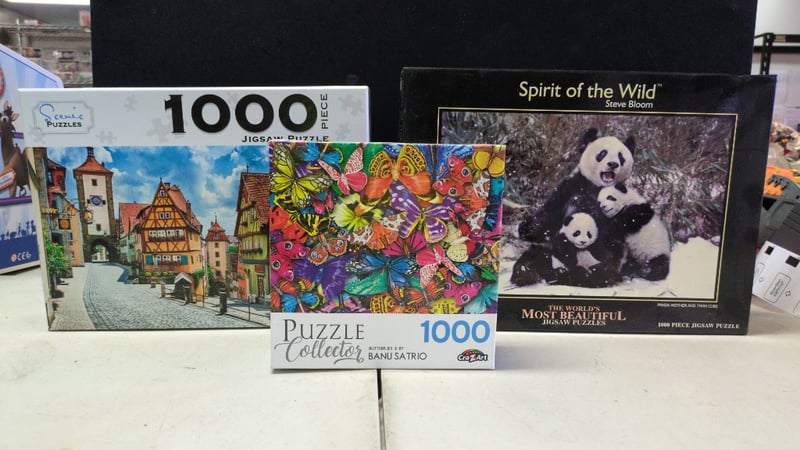 Assorted 1000 Piece Puzzles Including Butterflies, Pandas, And More