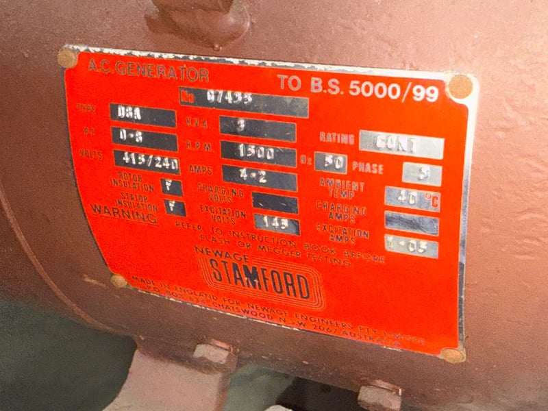 Kubota Diesel Generator – 3kVA Stamford Single Phase 240VPowered by a Kubota industrial diesel engine, this unit is mounted on a heavy-duty steel base and paired with a Stamford DBA alternator rated at 3kVA, single phase, 240V, 50Hz.Generator Specs: • Kubota diesel engine • Stamford / Newage alternator • 3kVA output • 240V single phase • 50Hz • 1500 RPM • 0.8 PF • 4.2 amps • Heavy-duty skid mount • Radiator cooled • Industrial muffler fittedPlate details show: • Type: DBA • No: 57493 • Rating: CONT • Excitation volts: 145Location: Tweed Heads, NSW