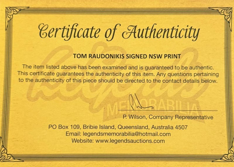 A Black Framed 1980 Nsw State Of Origin Print Measuring 14 X 11 Personally Signed By Inaugral Nsw Captain, Tom Raudonikis. Thomas Raudonikis Was An Australian Rugby League Footballer And Coach. Raudonikis Played 40 International Games And World Cup Games As Australia'S Representative Halfback And Captained His Country In Two Matches Of The 1973 Kangaroo Tour. The Item Is Accompanied By A Certificate Of Authenticity.