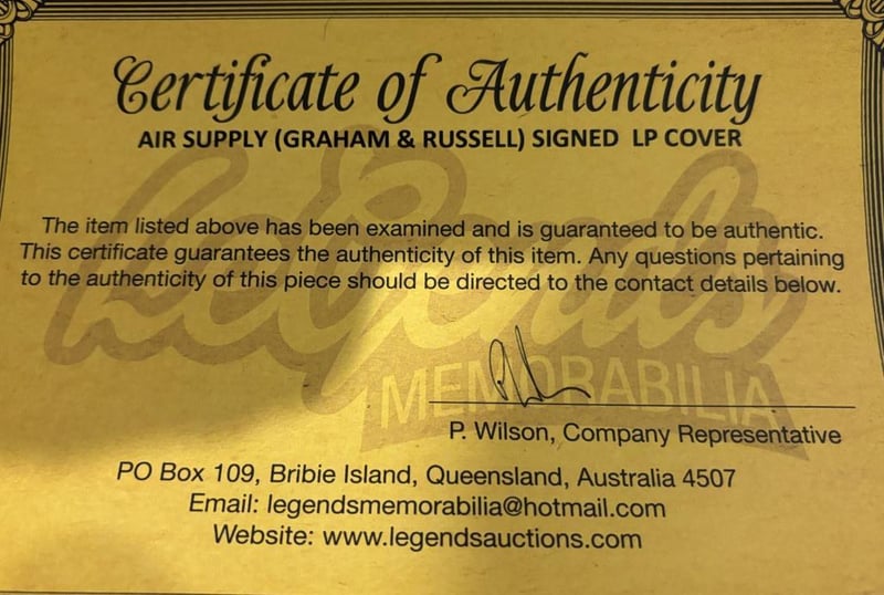 AIR SUPPLY SIGNED & FRAMED LPAir Supply'S Greatest Hits Lp Personally Signed By Russell Hitchcock And Graham Russell. The Cover Is Framed With The Vinyl. Measuring 650 X 400, This Is Ready To Hang. The Item Is Accompanied By A Certificate Of Authenticity.Condition: Good - Refer Images584529+50
