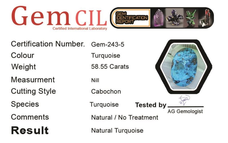 58.55 CARATS NATURAL QUALITY TURQUOISE 58.55 Carats Natural Quality Turquoise Stone = Natural TurquoiseWeight = 58.55 Carats Cut = Cabochon Colour = TurquoiseQuantity = 1Note = Gem Cil, Certified, Condition: Good - Refer Images 0488574+5