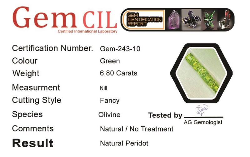 6.80 CARATS NATURAL LUSTROUS PERIDOT 6.80 Carats Natural Lustrous PeridotStone = Natural PeridotWeight = 6.80 CaratsColour = Green Cut = Fancy Note = Gem Cil, Certified, Precise Custom Cut (Not Commercial) Condition: Good - Refer Images 0488574+10