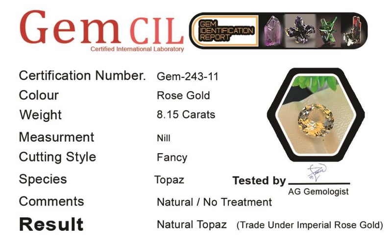 8.15 CARATS NATURAL IMPERIAL ROSE GOLD TOPAZ 8.15 Carats Natural Imperial Rose Gold Topaz Stone = Natural TopazWeight = 8.15 Carats Colour = Rose Gold Cut = Fancy Lustre = Excellent Treatment = Natural, No TreatmentQuality = Vvs (Premium)Note = Precise Custom Cut (Not Commercial) Condition: Good - Refer Images 0488574+11