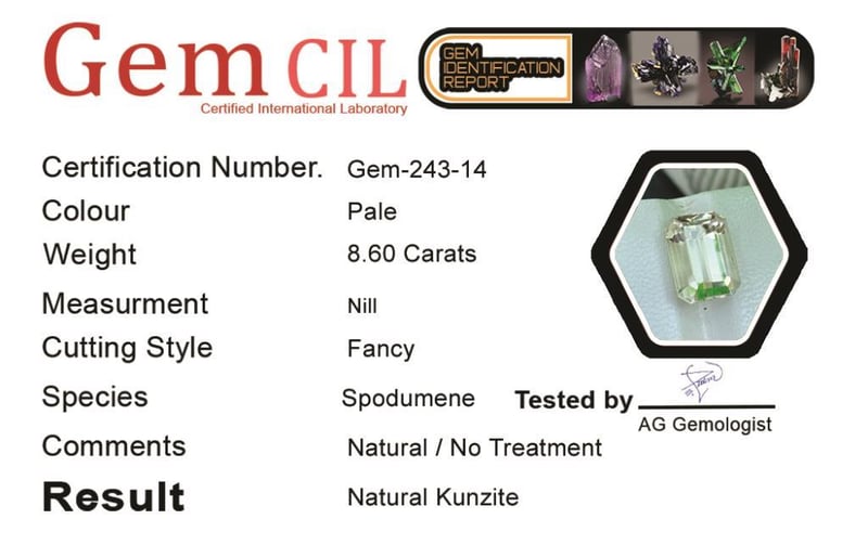 8.60 CARATS NATURAL QUALITY KUNZITE 8.60 Carats Natural Quality Kunzite Stone = Natural KunziteWeight = 8.60 Carats Colour = PaleCut = Fancy Lustre = ExcellentNote = Gem Cil, Certified, Precise Custom Cut (Not Commercial) Condition: Good - Refer Images 0488574+14