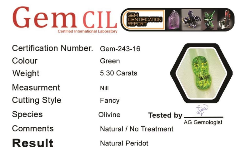 5.30 CARATS NATURAL LUSTROUS PERIDOT 5.30 Carats Natural Lustrous PeridotStone = Natural PeridotWeight = 5.30 CaratsColour = Green Cut = Fancy Note = Gem Cil, Certified, Precise Custom Cut (Not Commercial) Condition: Good - Refer Images 0488574+16