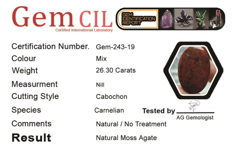 26.30 CARATS NATURAL MOSS AGATE 26.30 Carats Natural Moss AgateStone = Moss AgateWeight = 26.30 Carats Treatment = No Treatment (Natural)Cut = Cabochon Quantity = 1Note = Gem Cil, Certified, Condition: Good - Refer Images 0488574+19
