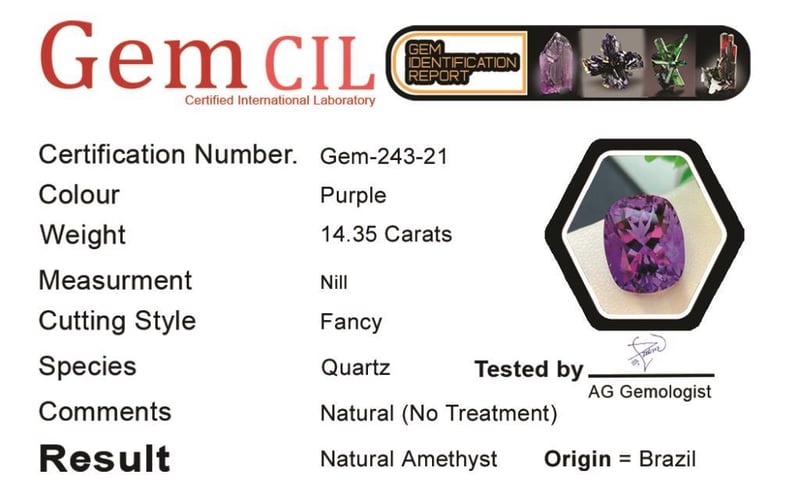 14.35 CARATS NATURAL QUALITY BRAZILIAN AMETHYST 14.35 Carats Natural Quality Brazilian AmethystStone = Natural AmethystWeight = 14.35 CaratsTreatment = Natural Colour = Purple Cut = Fancy Note = Gem Cil, Certified, Precise Custom Cut (Not Commercial) Condition: Good - Refer Images 0488574+21