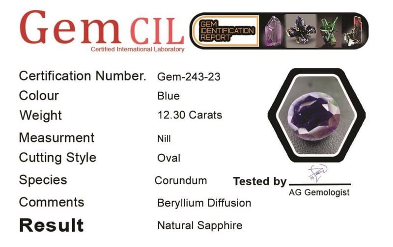 12.30 CARATS NATURAL CERTIFIED SAPPHIRE 12.30 Carats Natural Certified Sapphire Stone = Natural SapphireWeight = 12.30 Carats Cut = Oval Colour = BlueLustre = ExcellentTreatment = Beryllium Diffusion Note = Gem Cil, Certified, Precise Custom Cut (Not Commercial) Condition: Good - Refer Images 0488574+23