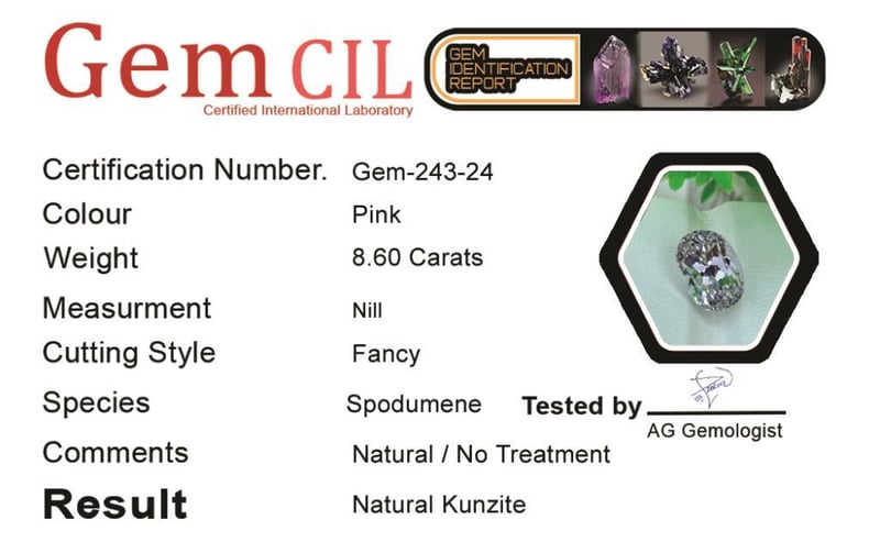 8.60 CARATS NATURAL KUNZITE 8.60 Carats Natural Kunzite Stone = Natural KunziteWeight = 8.60 Carats Colour = PinkCut = Fancy Lustre = ExcellentNote = Gem Cil, Certified, Precise Custom Cut (Not Commercial) Condition: Good - Refer Images 0488574+24