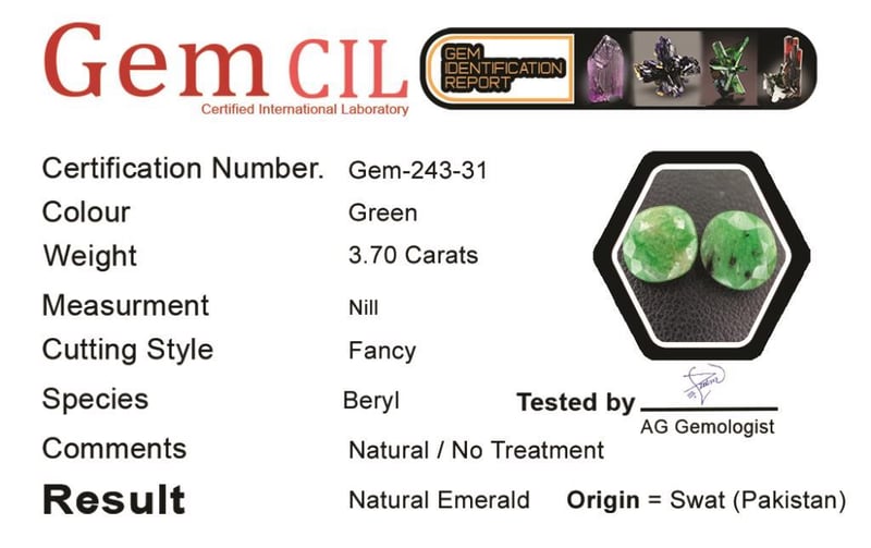 3.70 CARATS NATURAL GEMMY EMERALD 3.70 Carats Natural Gemmy EmeraldStone = Natural EmeraldWeight = 3.70 Carats Colour = Green Cut = FancyTreatment = No Oil (Natural)Origin = Swat (Pakistan) Note = Gem Cil, Certified, Precise Custom Cut (Not Commercial) Condition: Good - Refer Images 0488574+31