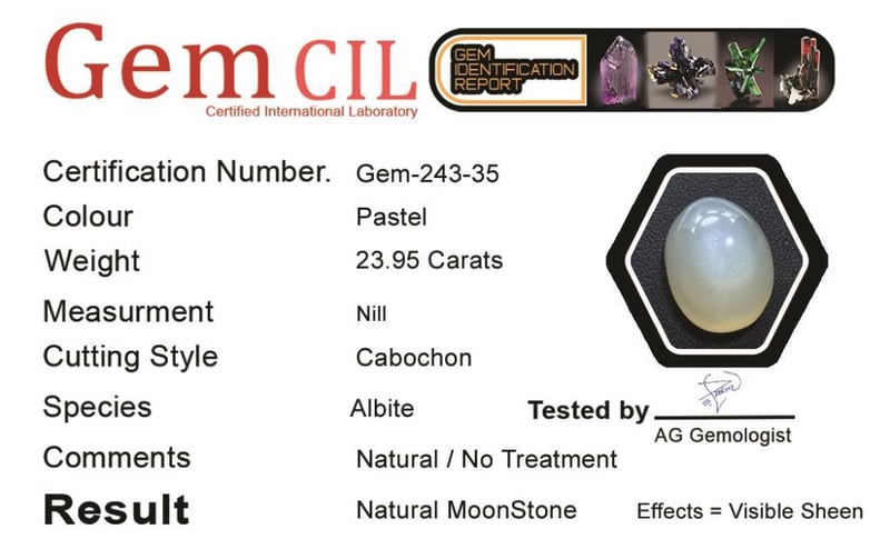 23.95 CARATS NATURAL MOONSTONE 23.95 Carats Natural MoonstoneStone = Natural MoonstoneWeight = 23.95 Carats Colour = Pastel Cut = Cabochon Lustre = ExcellentEffect = Nice Visible SheenNote = Picture Taken Under Light Gem Cil, Certified, Condition: Good - Refer Images 0488574+35