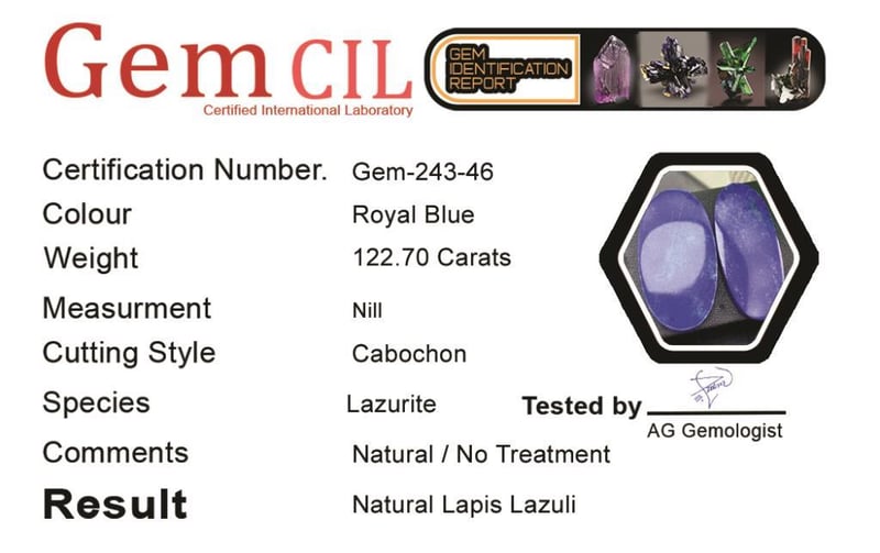 122.70 CARATS NATURAL ROYAL BLUE LAPIS LAZULI 122.70 Carats Natural Royal Blue Lapis Lazuli Stone = Natural Royal Blue Lapis LazuliWeight = 122.70 CaratsTreatment = Natural (Not Dyed) Cut = Cabochon Note = Gem Cil, Certified, Condition: Good - Refer Images 0488574+46