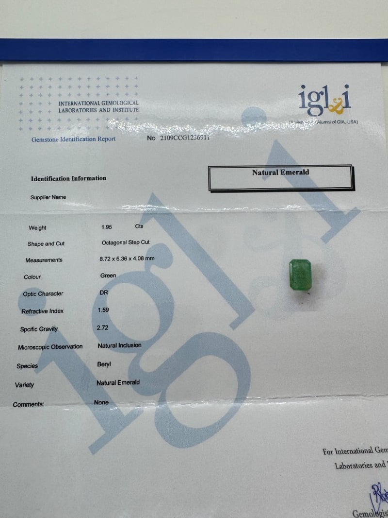 1.95CT NATURAL EMERALD OCTAGONAL STEP CUT1.95Ct, Green, Octagonal Step CutCondition: Good - Refer To Images584473+8