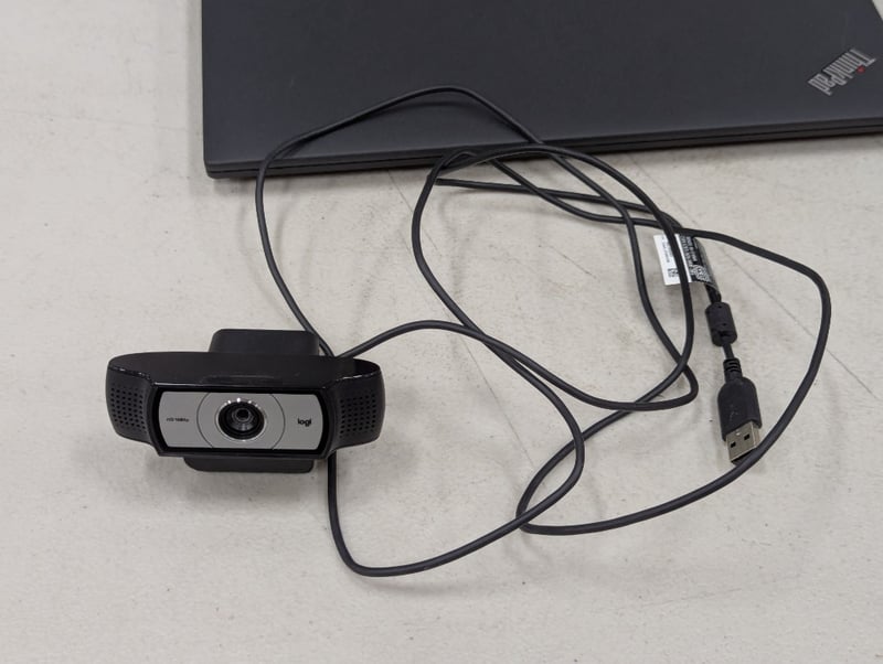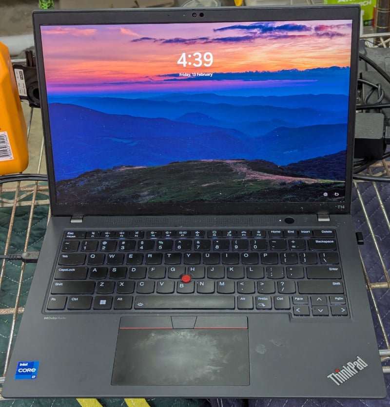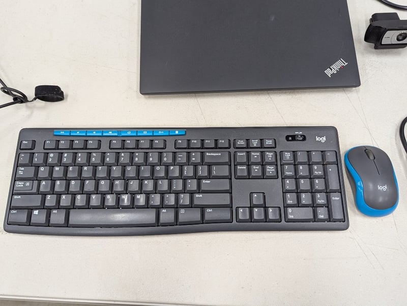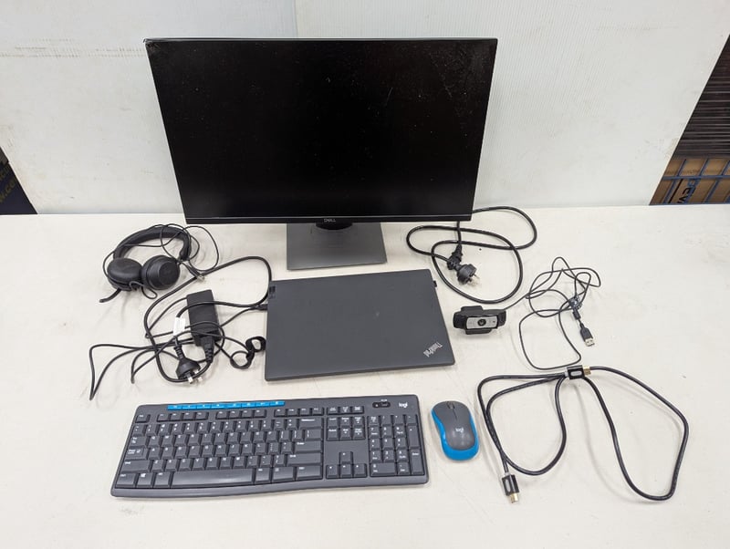 Lenovo ThinkPad with dell monitor, headphones, webcam and logitech keyboard and mouse, adjustable height monitor, monitor corner crackedMonitor,keyboard and mouse untested