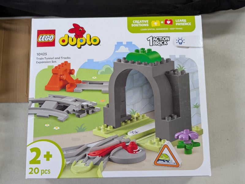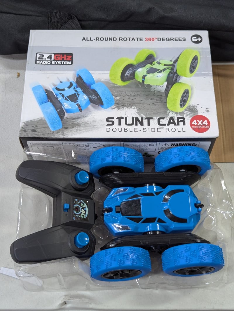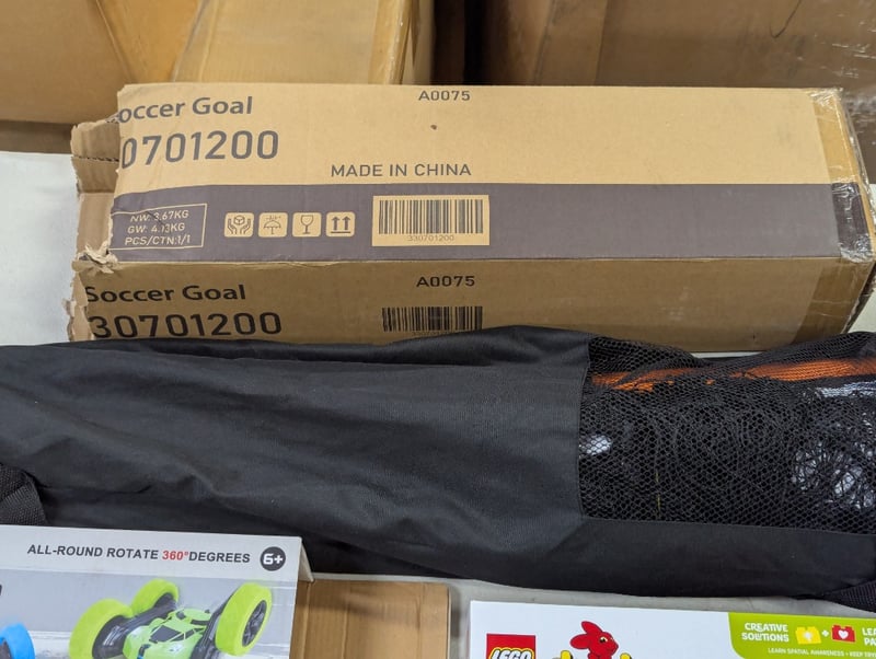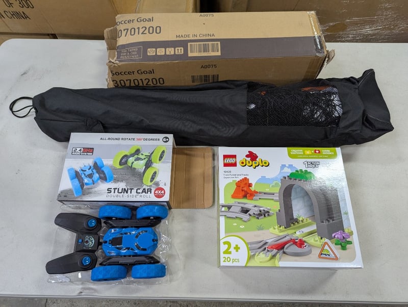 Portable soccer goal, radio controlled double-side roll stunt car, lego duplo train tunnel and tracks setSold as lot