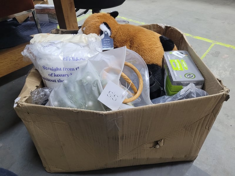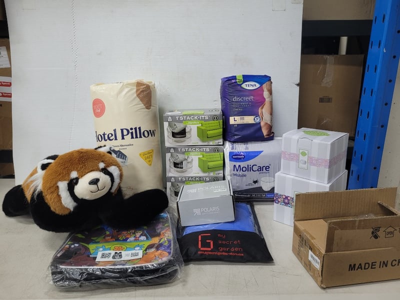 Hotel pillow, furniture riser legs, stuffed toy, scooter school bag, assorted padded underwear (sold as lot)