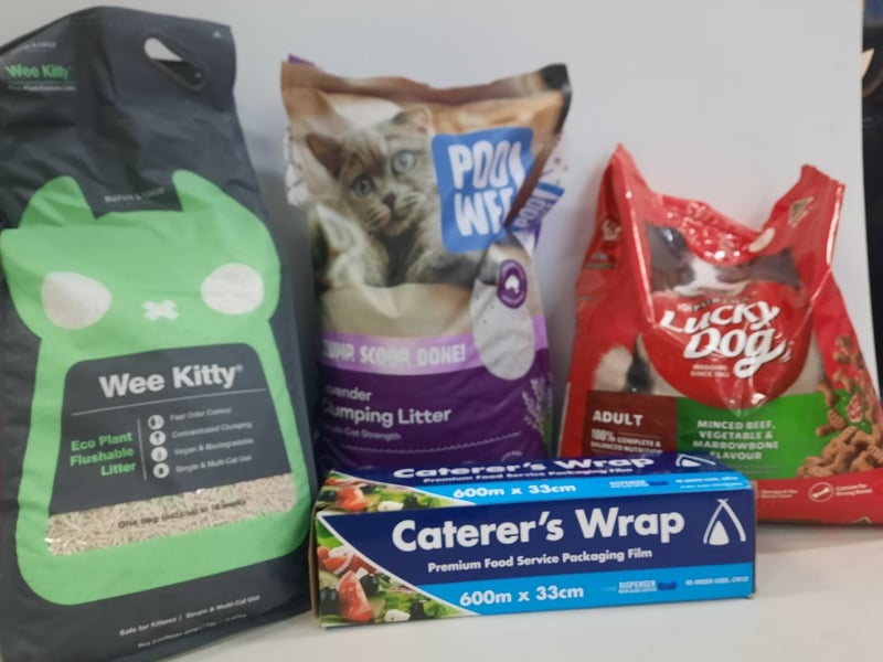 Assorted Lot, Including Cat litter, Dog food, And Caterer's WrapSOLD AS LOT