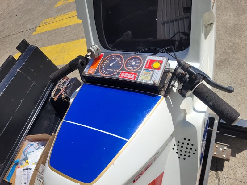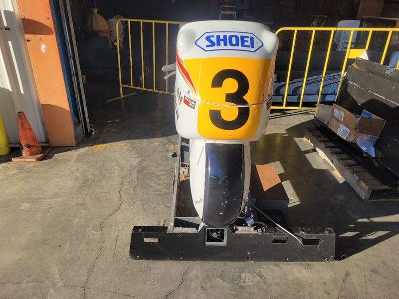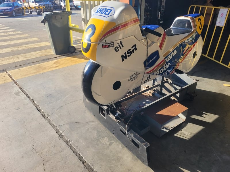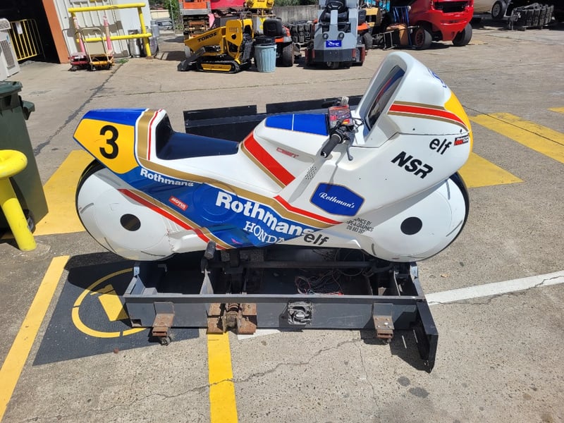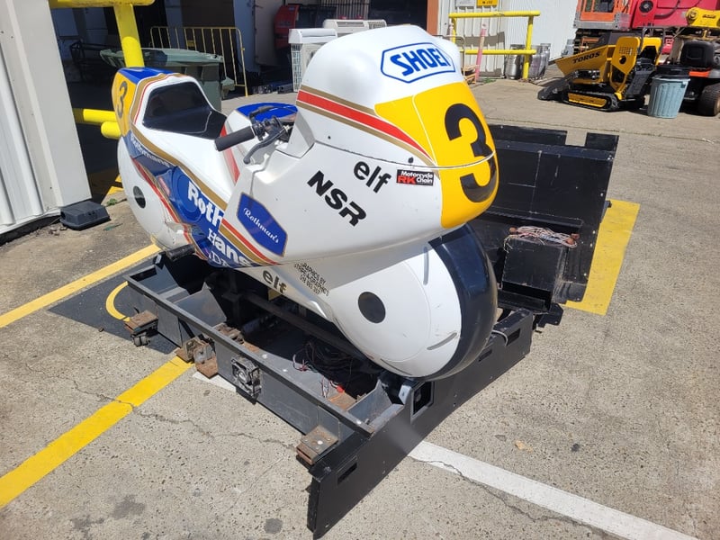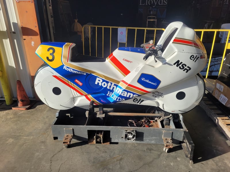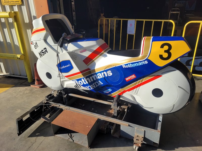 Rothmans Honda NSR500 Vintage 1980s Grand Prix Racing Arcade- Style Simulator Shell. Styled to mimic the 500cc two-stroke V4 machines ridden by champions like Eddie Lawson and Wayne Gardner.