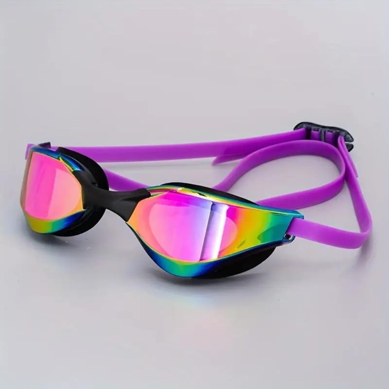 1 x Purple Racing/Training Swimming Goggles: One pair of silicone racing/training swim goggles, purple with purple mirrored lens, includes three nose-pieces, hard plastic storage case, unisex, adults 8+, unbranded