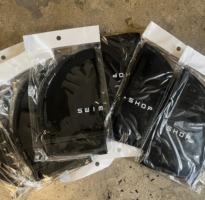 20 x Black Swim Caps: One lot of 20 silicone swimming caps, black in colour, branded 'swim.shop', one size fits all