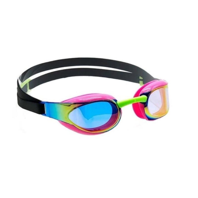1 x Pink Racing Swimming Goggles: One pair of silicone racing swim goggles, pink with mirrored lens, includes three nose-pieces, hard plastic storage case, unisex, adults 8+, unbranded